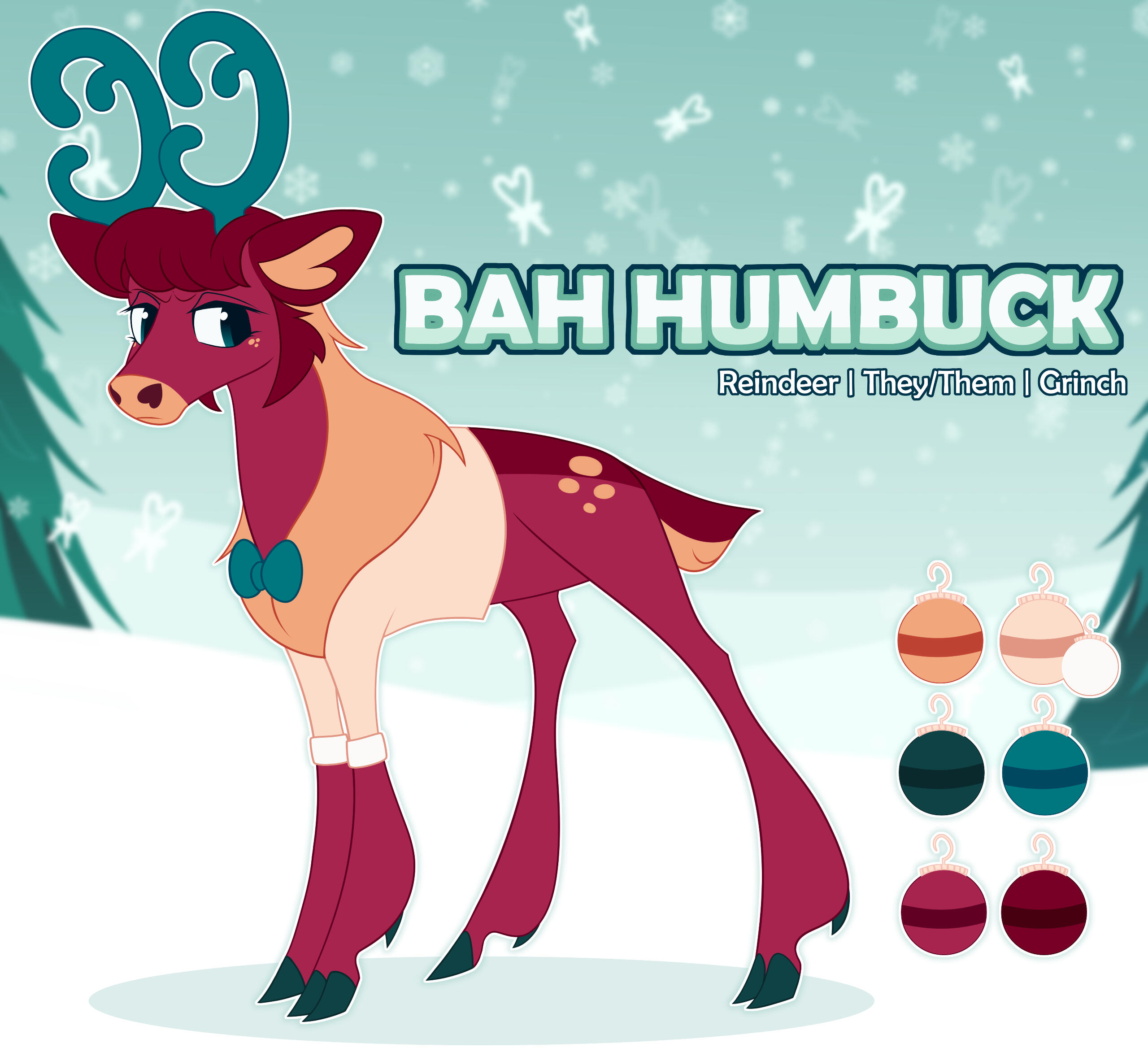 Bah Humbuck is a grinchy reindeer who, much to their horror, lives in Ponyville… right across the street from the perpetually jolly Merrymint. Known for their equally perpetual scowl, Bah despises the holiday season and everything it stands for. The very sight of falling snow makes their antlers ache for sunny days and sandy shores. When winter comes, Bah hides in their ornament-less home, cursing Merrymint’s twinkling lights and cheery carols. Their cold demeanor melts with the snow, however, transforming into a beach bum with a taste for gin and tonic. Their summer outfit consists of sunglasses, camo cargo shorts, and a muscle tee.