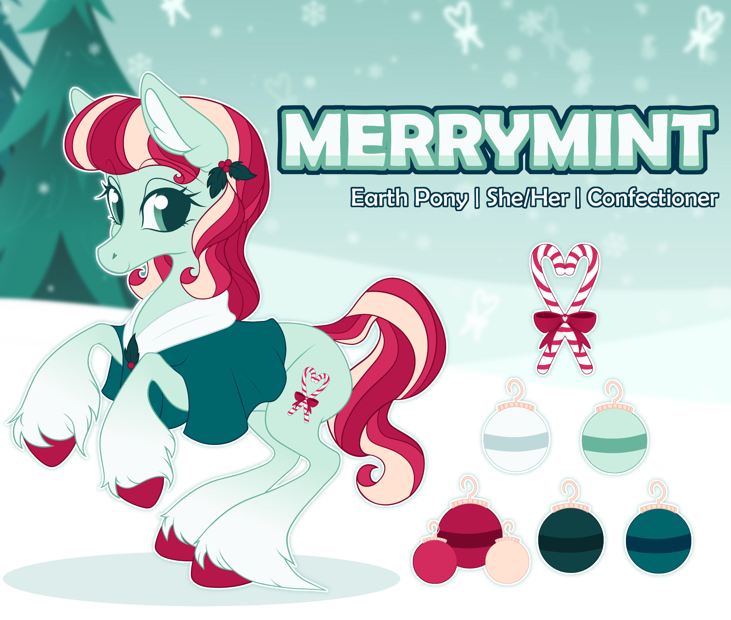 Merrymint is a confectioner pony living on the outskirts of Ponyville. This minty Earth pony possesses a heart as warm and bright as the Fire of Friendship. She aspires to bring joy to all creatures across Equestria. During the holiday season, Merrymint lovingly bakes sweet winter treats for Ponyville's residents with her jackalope friend, Snow Angel. Unlike other ponies, Winter Wrap Up is her least favorite holiday, but she knows the thawing of the season gives her time to make next year's Hearth's Warming even better than the last! She enjoys long sleigh rides through town and the chill of peppermint.