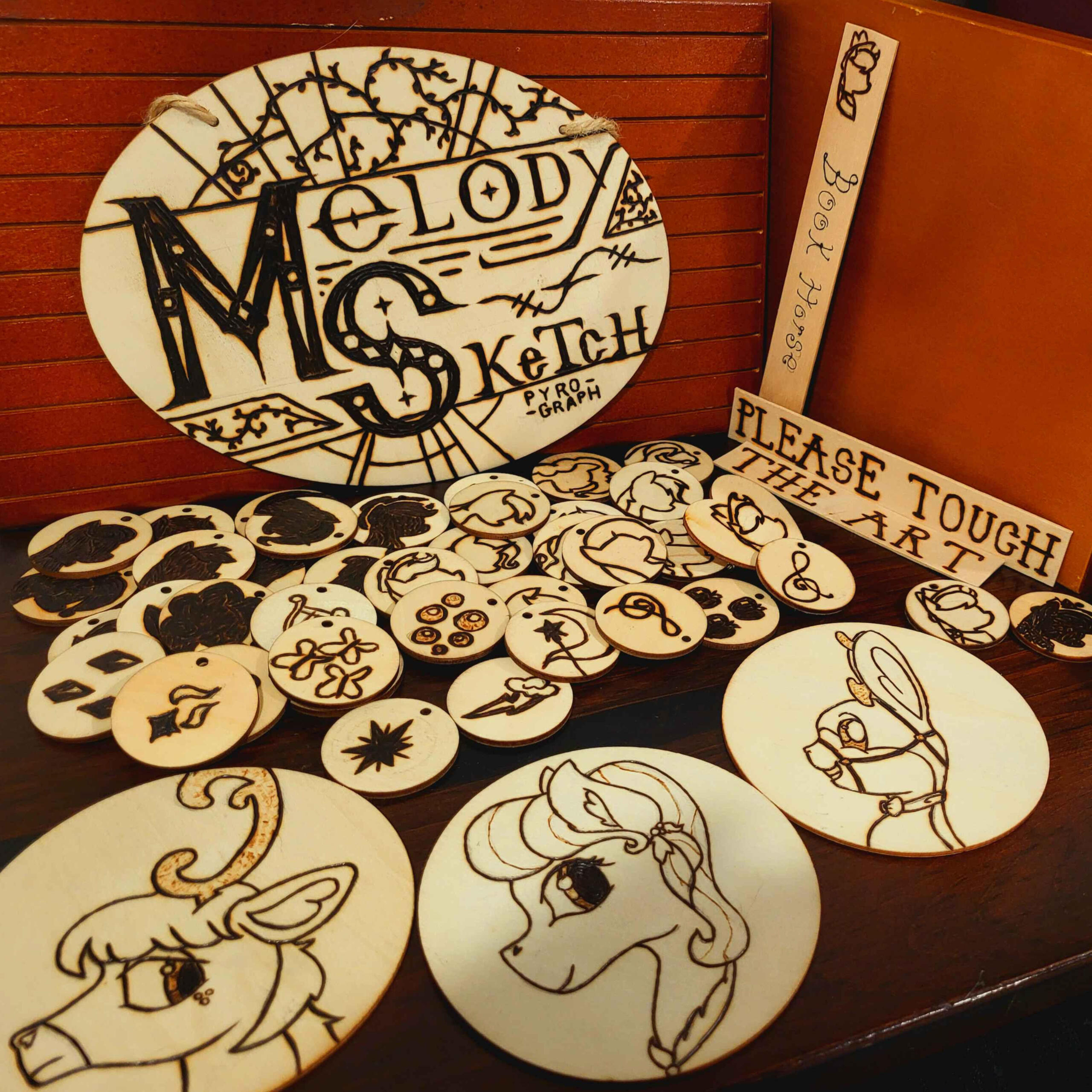 Melody Sketch is a NY-based artist originally from the South. Specializing in pyrography, Melody sells hand-drawn and handmade wood art and jewelry. She burns panels by hand, not by laser, making every piece uniquely imperfect. Pieces are crafted with care for both product and buyer, and all jewelry is treated with hypoallergenic jojoba oil.